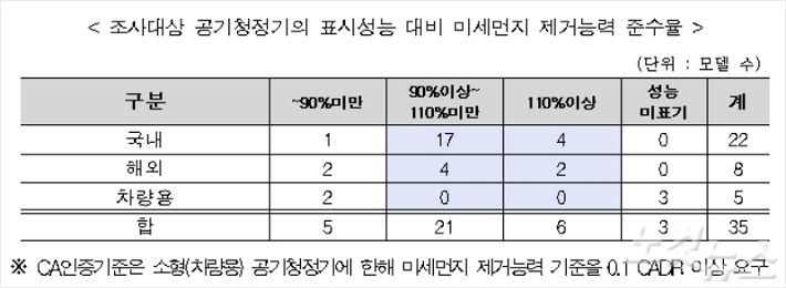 시중에 판매되고 있는 가정용‧차량용 공기청정기 35개 제품 가운데 5개가 표시된 성능 대비 실제 미세먼지 제거 능력이 떨어지는 것으로 밝혀졌다. 일부 제품은 필터에 유해물질이 함유된 사실도 드러났다.