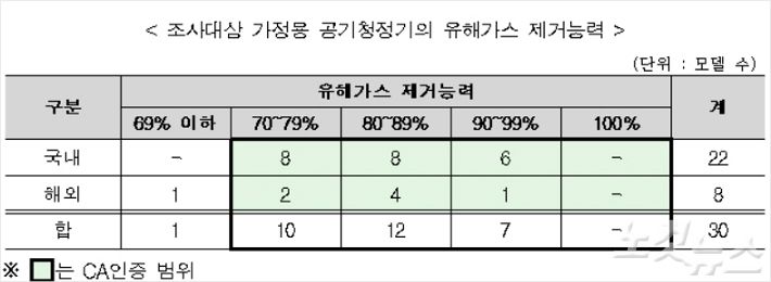 차량용 3개 모델은 아예 이같은 성능 표시가 돼있지 않았고, 나머지 2개 모델 역시 표시 성능 대비 제거 능력이 4~5%에 불과했다.