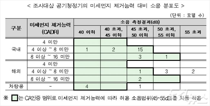 소음 문제에서 가정용 공기청정기 국내 22개 모델은 인증 기준을 모두 만족했지만, 해외 8개 모델 가운데 HealthPro150(IQ AIR), KC-J60K-W(샤프), AC-M2-AA(샤오미), AC-M3-CA(샤오미), PT7035(테팔)와 차량용 공기청정기 k1(ipipoo)은 성능에 따라 붙여지는 45~55dB의 범위를 벗어났다.