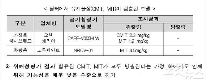 ‘필터 안전성’ 문제도 지적됐다. 가정용 공기청정기 CAPF-V060HLW(오텍캐리어, 에어원 필터)와 차량용 공기청정기 NRCV-01(노루페인트, 코버 필터)의 필터에 CMIT, MIT가 각각 최대 2.3㎎/㎏과 3.5㎎/㎏씩 함유된 것으로 나타난 것이다.