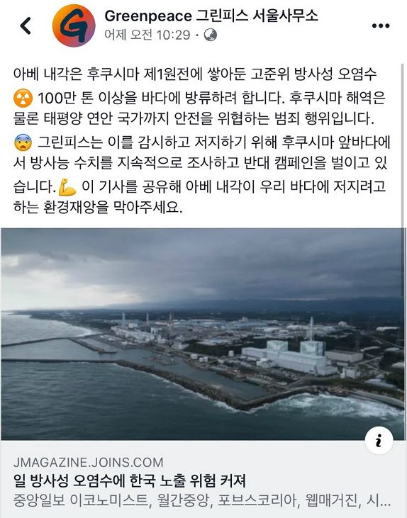 지난 6일 그린피스 서울사무소는 SNS를 통해 일본 정부가 후쿠시마 제1원전에서 발생한 고준위 방사선 오염수 100만톤 이상을 태평양에 방류할 계획이라며 경고했다(사진=그린피스 서울사무소 페이스북 캡처)