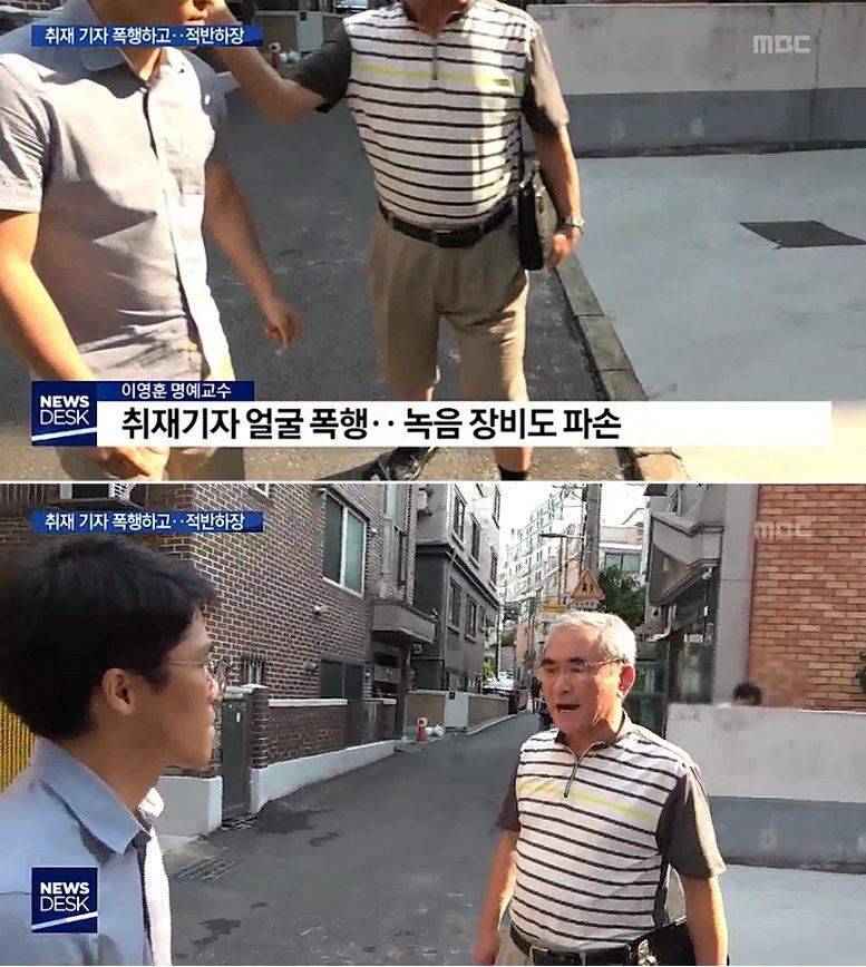 이 전 교수의 책과 발언 등이 논란이 되자 MBC '스트레이트' 취재진은 지난 4일 이 전 교수 자택 앞에서 그를 만나 입장을 듣고자 했다. 그러나 이 교수는 취재기자에게 고함을 지르고 녹음 장비를 내려치는 것은 물론, 취재기자에게 손찌검까지 했다. 취재진에 따르면 이후에도 이 전 교수는 취재진에게 약 20분간 '야, 인마' 등의 폭언과 반말을 섞어가며 강압적인 태도를 이어갔다. 이 같은 장면은 지난 7일 MBC 메인뉴스 '뉴스데스크'를 통해 방송되기도 했다.