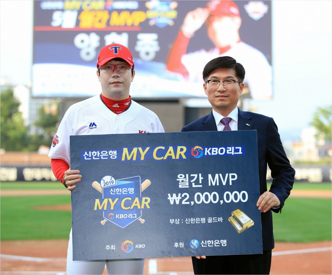 KIA 양현종(왼쪽)이 KBO 리그 5월 MVP에 뽑힌 뒤 수상하는 모습.(사진=KIA)