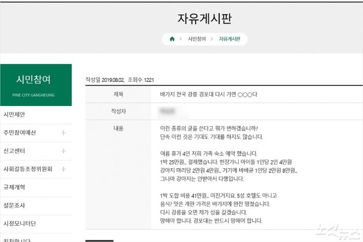 4인 가족이 강릉을 찾았다는 박 모 씨는 지난 2일 강릉시청 자유게시판에 '바가지 천국 강릉 경포대에 다시 가면 ○○○다'라는 제목을 글을 올리며 강한 불만을 쏟아냈다.