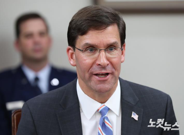 마크 에스퍼 미국 국방부 장관이 9일 오전 서울 용산구 국방부에서 열린 한미 국방장관 회담에서 모두발언을 하고 있다.