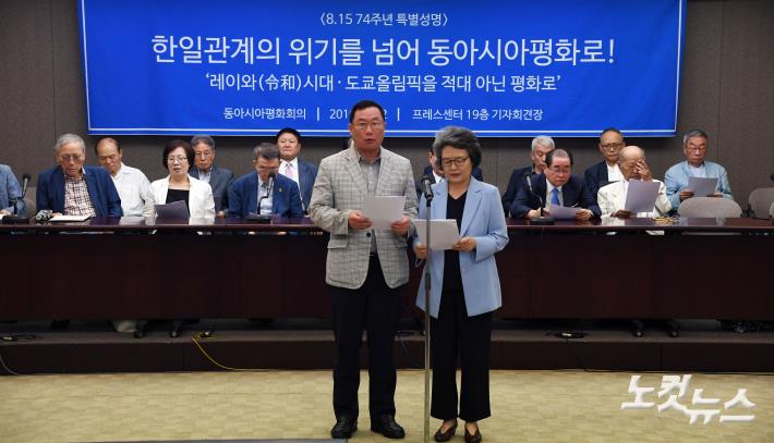 류종열 흥사단 이사장과 이현숙 여성평화외교포럼 명예회장이 12일 오전 서울 중구 프레스센터에서 ‘한일관계의 위기를 넘어 동아시아 평화로’ 라는 주제로 8.15 74주년 특별성명을 발표하고 있다.