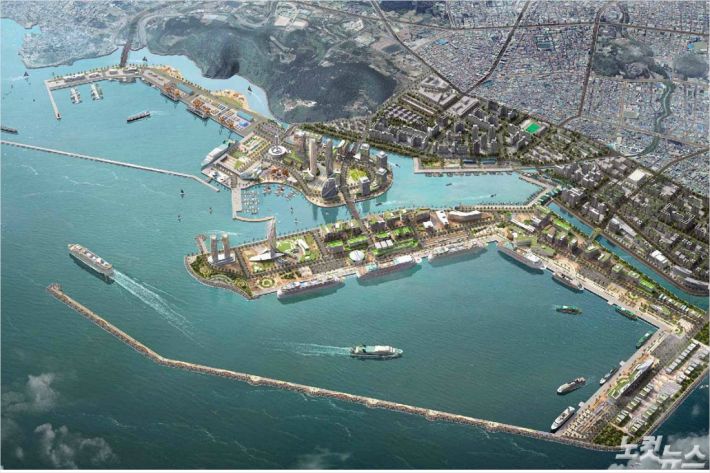 ◆ 현덕규> 근데 사실은 그 경제효과라는 거는 조금 더 디테일을 들여다 볼 필요가 있어요. 기본적으로 항만이라는 거는 물류기능의 핵심입니다. 그래서 지금 신항만 개발이 사실은 전면에 탑동 앞 전면에 대규모로 매립을 나가고, 앞쪽으로 한참 튀어 나가서 이렇게 큰 항구 면적을 갖는 부분이 크루즈, 여객선 이런 식으로 돼있기 때문에. 그게 전면에 되어 있는데 사실은 그 계획 중에는 화북 쪽으로 화물 부두를 넓히는 부분도 있어요.