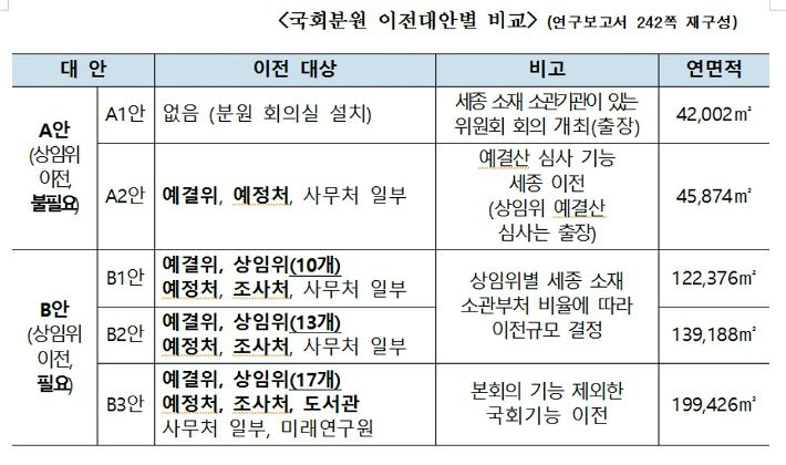 국토연구원이 지난 1월부터 6개월간 진행한 연구 용역에서 연구원은 상임위 이전이 포함되지 않은 A안 두 가지와 상임위 이전이 포함된 B안 세 가지 등 모두 5가지 대안에 대한 국회 분원 설치 방안을 검토했다.
