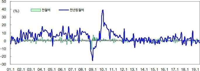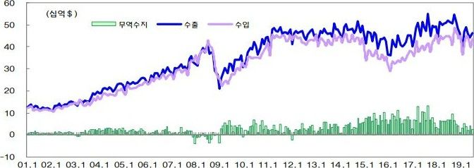 특히 수출은 반도체 업황 부진이 지속된데다, 미중 무역분쟁이 장기화되면서 7월 잠정치가 전년동월대비 11.0% 감소한 461억 4천만달러를 기록해 지난해 12월 이후 8개월 연속 내리막길을 걸었다.