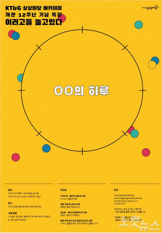 올해는 KT&G 상상마당 개편 12주년을 맞아 무료 특강으로 진행된다. KT&G 상상마당 홈페이지를 통해 선착순으로 신청할 수 있다.