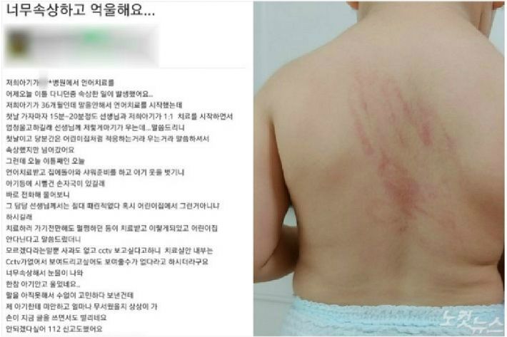 글을 올린 아이의 어머니 B(30)씨는 "아이가 36개월인데 말을 잘 못해 언어치료를 시작했다"며 "이틀째 치료를 받고 귀가해 아이를 씻기기 위해 옷을 벗기니 등에 시뻘건 손자국이 있었다"고 토로했다.
