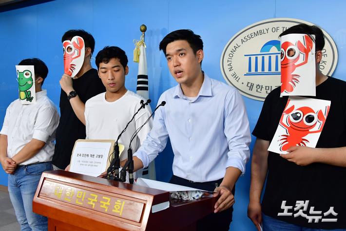 공정사회를 위한 대학생 모임 학생들이 23일 오전 국회 정론관에서 조국 법무부 장관 후보자와 딸의 의혹과 관련 기자회견을 갖고 있다.