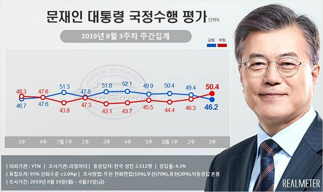 ◆ 이택수> 문재인 대통령의 8월 3주차 국정 수행 평가인데요. 46.2%의 긍정 평가. 지난주 대비 3.2%포인트 하락한 수치고요. 부정 평가는 취임 이후 처음으로 50.4%로 50%대로 올라섰습니다. 4.1%포인트 증가했습니다.