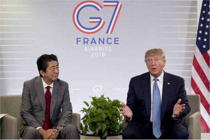 도널드 트럼프(오른쪽) 미국 대통령과 아베 신조 일본 총리가 25일(현지시간) 주요 7개국(G7) 정상회담이 열리고 있는 프랑스 비아리츠에서 양자회담을 하고 있다. (사진=연합뉴스 제공)