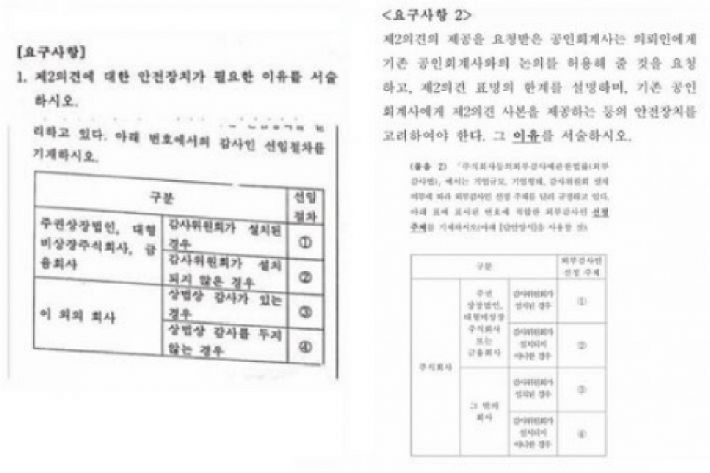 이후 6월 29~30일에 치러진 공인회계사 2차 필기시험 회계감사과목에는 '감사인의 제2의견'(문제 1-5의 요구사항2), '감사인 선정주체'(문제3-2)를 묻는 문제가 출제됐다.