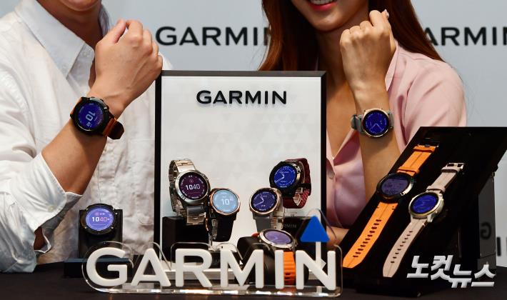 30일 오전 서울 중구 더플라자호텔에서 모델들이 가민(Garmin) 프리미엄 스마트워치 ‘피닉스6(Fenix 6)’를 선보이고 있다. 피닉스6 시리즈는 아웃도어 액티비티를 즐기는 유저에게 최적화된 모델로 배터리 성능이 대폭 강화돼 스마트 모드에서 1.5배, GPS 모드에서 2배 가량 늘어난 멀티스포츠 GPS워치다.