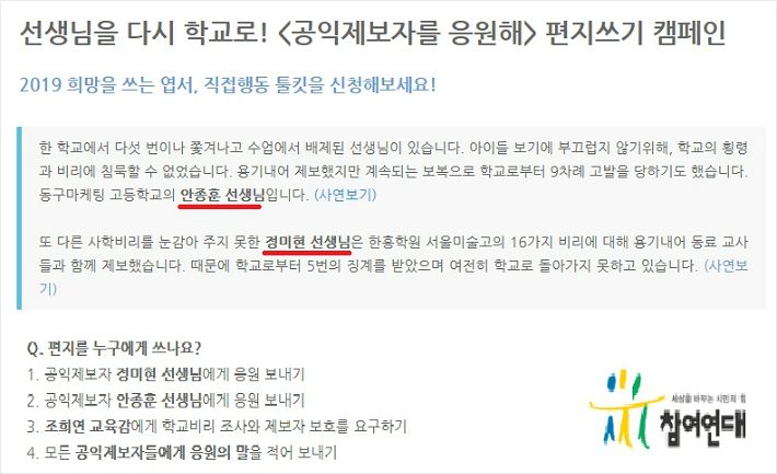 참여연대는 정미현, 안종훈 교사를 지원하기 위해 '선생님을 다시 학교로! 공익제보자를 응원하는 편지쓰기' 캠페인을 벌이고 있다.