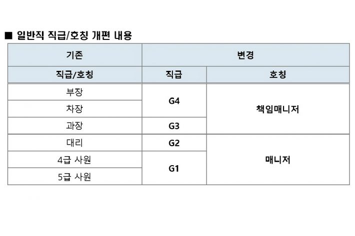5급사원과 4급사원은 G1으로 불리며 대리는 G2, 과장은 G3, 차장과 부장은 G4로 통합된다. 호칭은 더욱 단순화해 G1~G2는 매니저로 불리며 G3~G4는 책임 매니저로 구분된다. 팀장, 파트장 등 보직자는 기존처럼 직책을 호칭으로 사용한다.