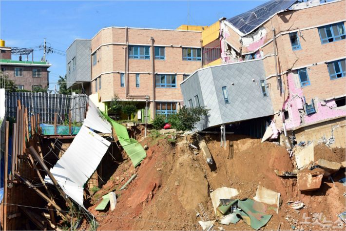 지난해 9월 7일 서울 상도동 공사현장에서 지반이 무너지면서 인근에 위치한 상도유치원 건물이 기울어졌던 모습. (사진=윤창원 기자)