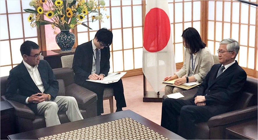 2019년 7월 19일 고노 다로(河野太郞) 일본 외무상이 일본 정부가 한국에 제안한 '제3국 중재위원회'의 설치 시한까지 한국이 답변하지 않았다며 남관표 주일 한국대사를 불러 항의하고 있다. (사진=연합뉴스)