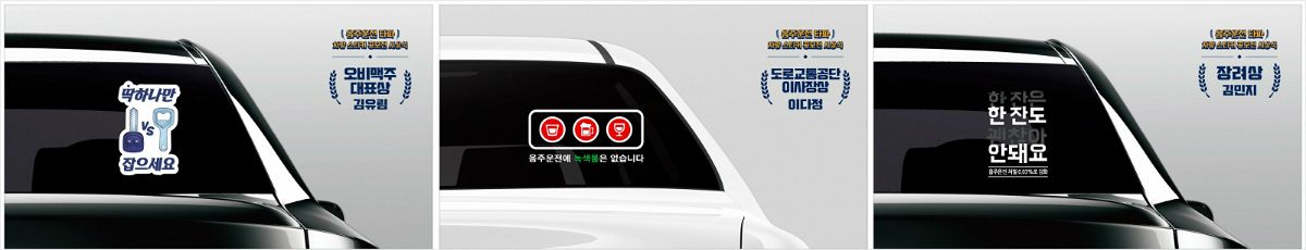 전시 작품은 '제2윤창호법(도로교통법 개정안)' 시행 한 달을 맞아 음주운전의 폐해를 알리고 위험한 습관을 타파하고자 오비맥주와 도로교통공단이 함께 개최한 '음주운전 타파 차량 스티커 공모전' 수상작 11개다.