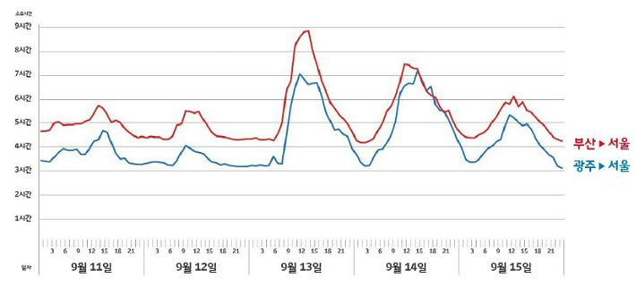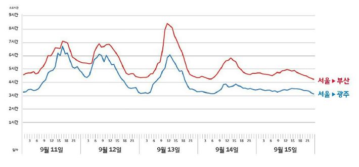 반대로, 이날 부산에서 오후1시에 서울로 출발할 경우 8시간50분이 소요될 전망이다. 이는 평소 동시간대 평균 소요 시간 대비 3시간20분이 더 걸리는 것이다.