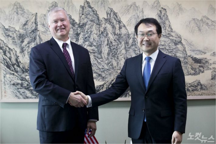 이 본부장과 비건 대표는 회동에서 이달 말 예상되는 북미 실무협상의 의제와 장소 등에 대해 협의할 것으로 알려졌다.