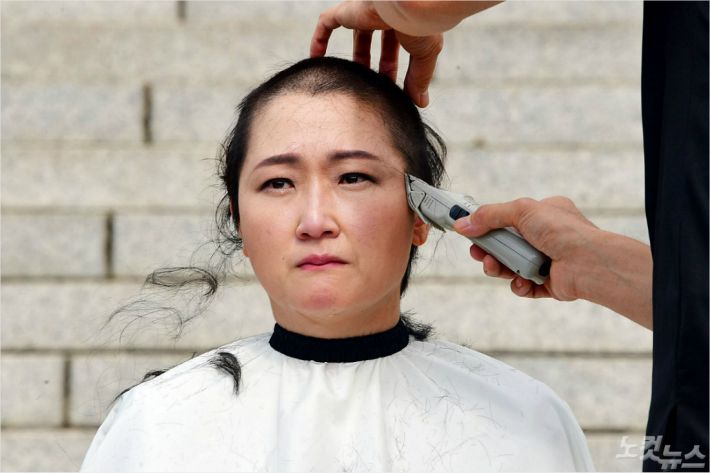 그리고는 흰 가운을 둘러 입고 의자에 앉아 삭발했다. 삭발 중에는 연신 훌쩍이며 눈물을 흘렸다. 앞에는 검은 바탕에 흰 글씨로 '대한민국 민주주의는 사망하였다'라고 적힌 현수막이 세워졌다.