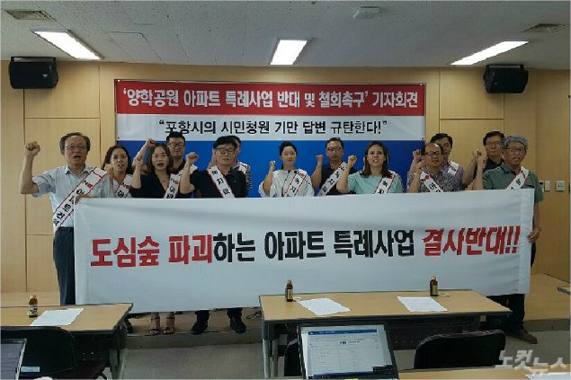 포항 양학공원 부지 인근 주민들 "녹지파괴 아파트건설 철회하라" 촉구