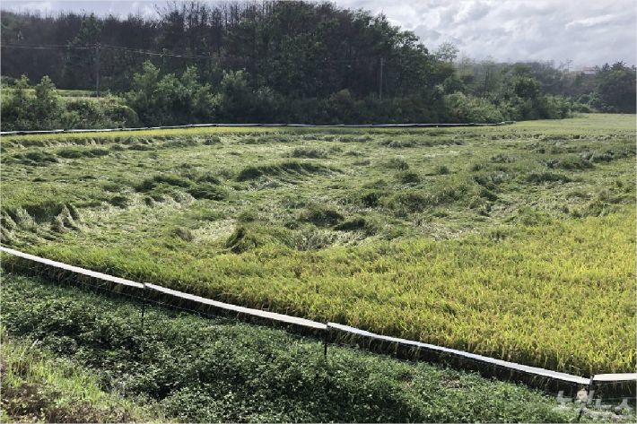 지난 7일 태풍 '링링'으로 속초시 장천마을에서 벼 도복이 발생했다. (사진=속초시청 제공)