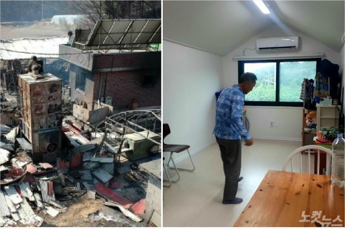 박 할아버지가 머무는 조립식 주택의 한 벽면에는, 산불이 발생하기 전 그가 무려 46년 동안 살았던 집을 찍어둔 사진이 붙어있어 더욱 안타까움을 자아냈다.