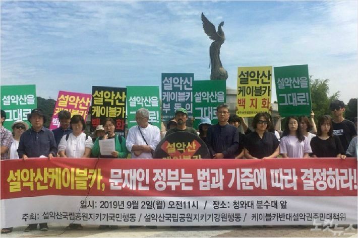 시민·종교단체들이 지난 2일 청와대 앞에서 설악산 오색케이블카 추진사업 백지화와 정치개입 중단을 촉구하는 기자회견을 열었다.(사진=설악산국립공원지키기국민행동 제공)