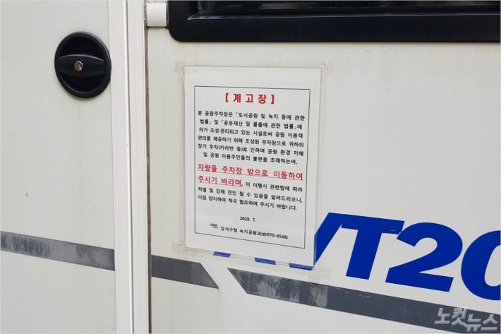 카라반 외부에는 장기주차로 주민들이 불편하니 차량을 이동하라는 구청 명의의 계고장이 붙어있다.