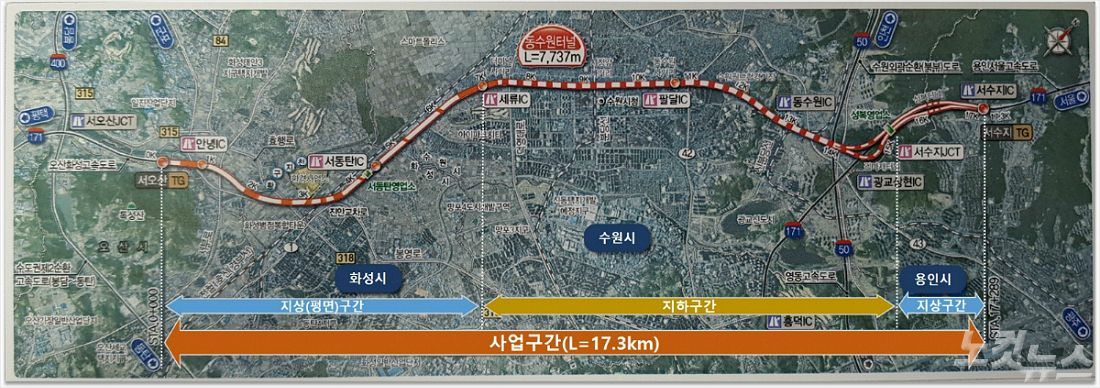 ◇ '오산~용인고속도로' 사업구간'오산~용인고속도로' 사업구간은 오산시 양산동(서오산TG)~용인시 성복동(서수지TG)를 연결하는 총 연장 17.3km다.