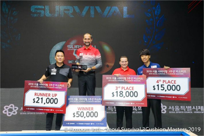 22일 밤 막을 내린 2019 서울 서바이벌 3쿠션 마스터즈 시상식 모습. 왼쪽부터 조재호, 세미 세이기너, 에디 멕스, 김행직.(사진=코줌)
