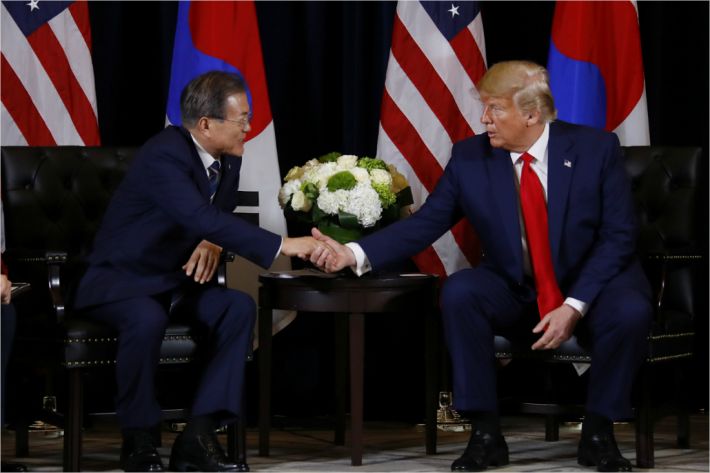 문재인 대통령이 23일 오후 (현지시간) 미국 뉴욕 인터콘티넨탈 호텔에서 도널드 트럼프 미국 대통령을 만나 반갑게 악수하고 있다. (사진=연합뉴스)