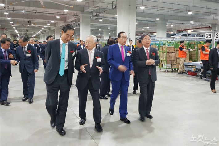 25일 다이소 부산허브센터 오픈 행사에 참석한 아성다이소 박정부 회장, 한국경영자총협회 손경식 회장 등이 물류센터 시설을 둘러보고 있다. (사진=부산CBS 박진홍 기자)