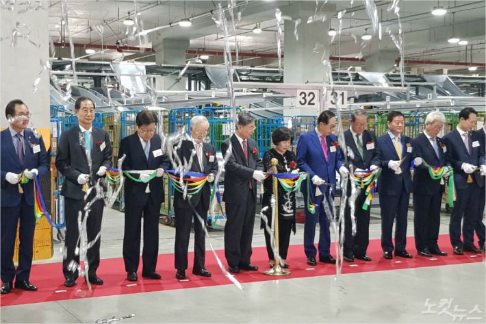 참석자들은 대지면적 7만 4천㎡, 연면적 14만㎡에 달하는 지상 5층·지하 1층짜리 대규모 창고 곳곳을 돌아보며 최첨단 자동화 물류 설비 앞에서 사진을 찍었다.