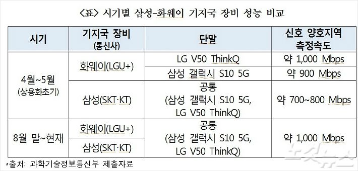 국회 과학기술정보방송통신위원회 소속 더불어민주당 변재일 의원이 과학기술정보통신부로부터 제출받은 '삼성-화웨이 5G 장비 성능 이슈 동향'을 보면 5G 상용화 초기에 화웨이 기지국을 사용하는 LGU+의 속도가 삼성 기지국을 사용하는 SKT, KT보다 약 20% 빠르게 측정됐다.