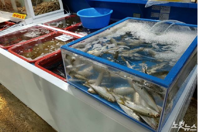 포항 죽도어시장 상가 수족관에 전어가 들어있다. (사진=김대기 기자)