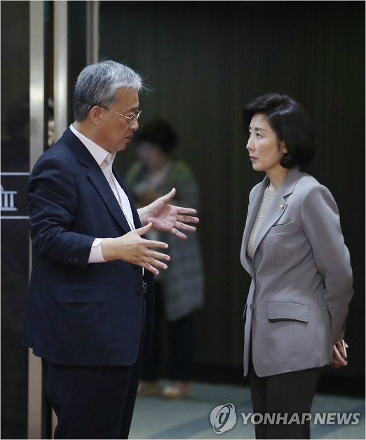 자유한국당 나경원 원내대표(오른쪽)와 대안정치연대 유성엽 대표가 26일 오후 국회 제1회의장에서 열린 정치 분야 대정부질문 중 회의장 밖으로 나와 대화하고 있다. (사진=연합뉴스 제공)