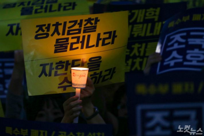 지난 27일 서울 중앙지검 앞에서 열린 '제7차 검찰개혁 촛불문화제'에서는 조 장관에 대한 의혹을 보도한 언론과, 수사 내용을 흘린 검찰에 대한 비난이 줄을 이었다.