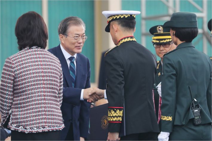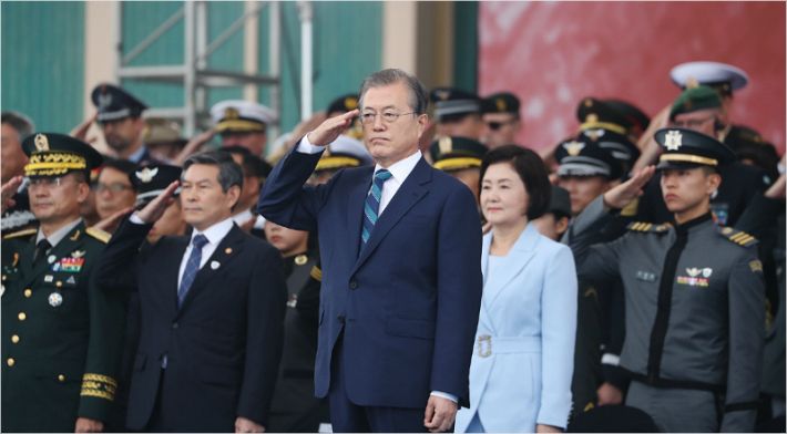 이날 문 대통령은 변화무쌍한 안보 환경에 대응하기 위해 '국방개혁 2.0 완수'를 통한 우리 군의 혁신을 다짐하기도 했다.