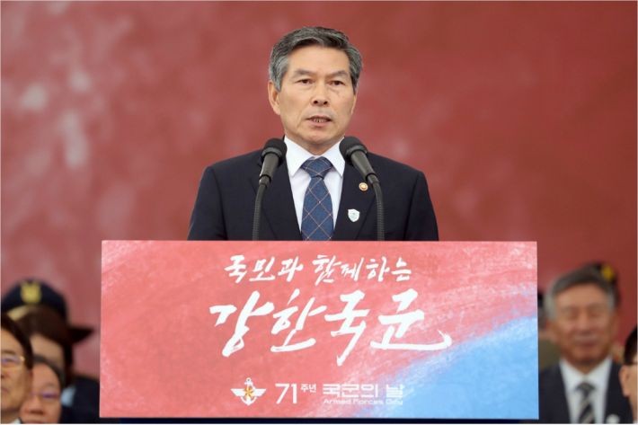 정 장관은 또 "우리 군은 급변하는 안보상황 속에서 적지 않은 어려움도 있었고 때로는 국민들께 실망을 안겨드리기도 했다"며 "그럼에도 불구하고 최전방 고지와 높은 파도와 싸우는 바다에서,그리고 드높은 하늘에서 우리 장병들은 묵묵히 그 자리를 지키며 완벽하게 제 역할을 해냈다"고 강조했다.