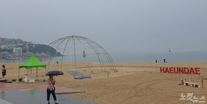 지난 2일 제18호 태풍 '미탁' 북상을 앞두고, 부산 해운대해수욕장에 마련된 비치코밍 축제의 구조물이 철골 구조만 남겨둔 채 철거된 상태(사진=강민정 기자)