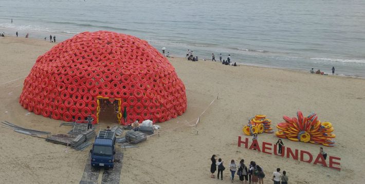 태풍 북상 전 해운대 비치코밍 축제 대표 구조물인 해운대돔은 사진과 같이 폐튜브가 철골 구조물 외형을 감싸야 하지만, 잇단 태풍으로 파손되면서 재설치를 여러차례 해야했다.(사진=부산 해운대구청 제공)