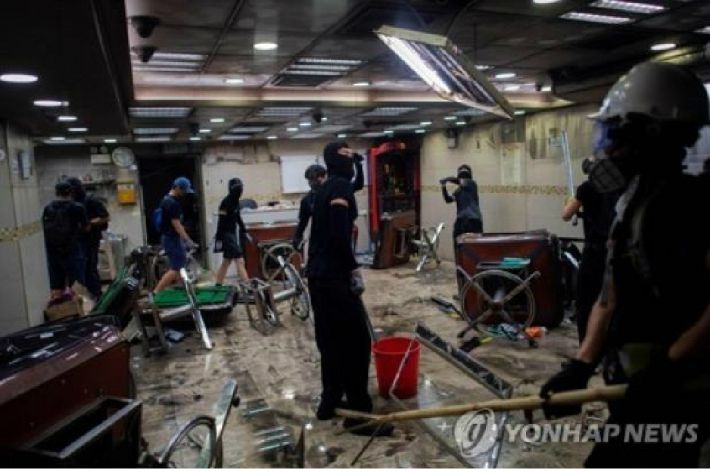 중국인 소유의 마작장을 때려부수는 홍콩 시위대. (사진=연합뉴스)
