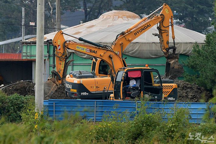 지난달 17일 돼지 전염병인 아프리카돼지열병(ASF)이 발생한 경기도 파주시의 한 양돈농장에서 방역당국 관계자들이 살처분 매몰 준비를 하고 있다. (사진=박종민 기자/자료사진)