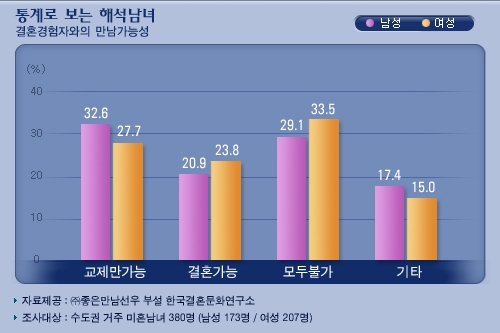 교제만 가능하다는 응답은 남성이 더 높았고, 결혼이 가능하다는 응답은 여성이 더 높았다. 초혼남과 재혼녀의 결혼이 늘고는 있지만, 남성들은 상대의 결혼경험에 대해 여성들보다 다소 유연성이 떨어진다는 것을 알 수 있다.