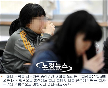2009학년도 대학수학능력시험이 끝나고 상위권 수험생들이 논술학원 수강 등 명문대 수시 전형 준비에 집중하면서 일부 고등학교에서는 이 학생들이 학교에 오지 않아도 출석으로 인정해 주거나 기말고사를 아예 면제해 주는 등 학사운용에 각종 편법들이 만연하고 있다.
